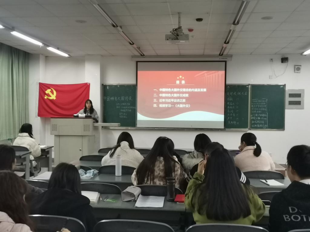 会议开始,何丽雯带领支部同志熟悉外交理念的内涵,其从外交政策主张、人类命运共同体构思和新型国际关系着力,以我国外交的发展进程为主线,阐述了中国特色社会主义外交理念中“讲信义、重情义、扬正义、树道义”的价值观和其中蕴含的“天下为公”的思想情怀。在此基础上,何丽雯历数我国的一系列外交成就,强调了外交工作在我国改革开放和提升国际地位等进程中的重要作用,以电影《战狼Ⅱ》中海外领事保护为例深刻说明了外交为民的宗旨。之后,何丽雯聚焦习近平总书记近月来对尼泊尔、希腊、巴西的外交行程,讲解我国外交中的伙伴关系网络。