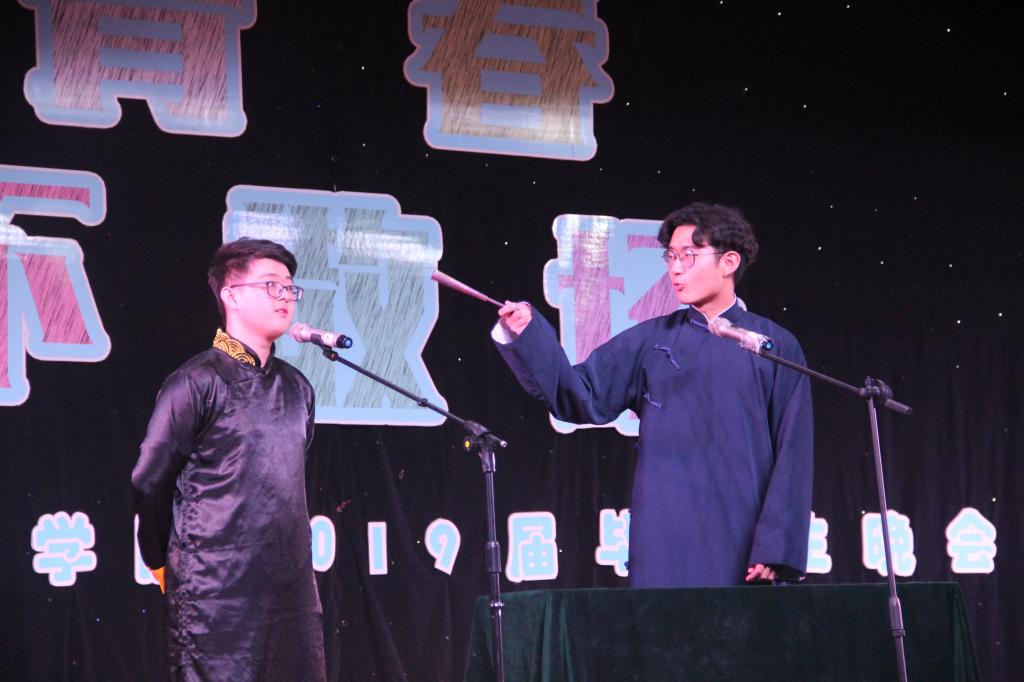 晚会在热烈的舞蹈《personal》中拉开帷幕,舞蹈团的同学们热情澎湃,点燃了这次晚会的火焰。紧接着,就是本次晚会第一轮激动人心的红包环节,首先潘宏书记上台抽取了1000元的红包作为这个幸运学生的家长来校观礼毕业生授位仪式路费,随后董尧老师也上台微信面对面建群,老师们一起在微信群中发红包,在场的同学们激动不已,脸上都洋溢着中奖后的喜悦。随后是小品团的同学们带来的《落叶归根》,在搞笑幽默的同时,又带来缕缕温情。之后是由毕业班同学罗明建和2017级同学张宇带来的对唱《同桌的你》,让台下同学陷入自己年少青涩爱恋的回忆之中。接下来继续的红包环节,更是点燃了台下观众的热情。热闹过后,舞蹈团的同学们又给大家带来热情动感的舞蹈《like it》,这将晚会的氛围推向了高潮。随后,是由两名2018级的同学胡博伦、赵培源带来的相声《随便说一段》,这让大家从红包环节的激动投入到了相声的魅力之中。接下来,又是激动人心的红包挑战环节,会场气氛渐至白热化。接着,是由几位毕业生们带来的节目诗朗诵和合唱,音韵感人,大家都流露出依依不舍的感情。本次晚会最为亮眼的节目,是张新全院长带领着老师和同学们穿着蒙古服装,合唱的《草原上升起不落的太阳》,18级的同学易永康在一旁呼麦、拉马头琴,两名女同学靳蓦然、柯璐在前伴舞,让我们在歌声中感受着大草原氛围。由毕业生周祥睿带领低年级学生魏诚刚等表演的吉他弹唱《等你下课》唯美抒情,让整个晚会在离别伤感的氛围中落下了帷幕。