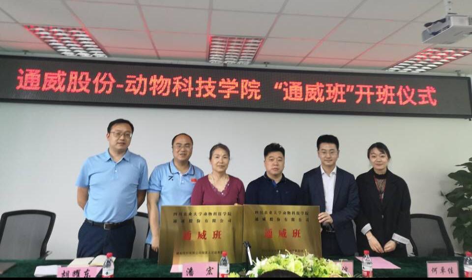 4月23日下午,动科学院与通威股份有限公司在7-1012会议室举行动科校企合作“通威班”开班仪式顺利举行。新葡的京集团8814党委书记潘宏、党办主任胡耀东、副主任董尧、通威股份华西片区人力资源总监向波,通威班班主任侯佳薇参加了开班仪式。