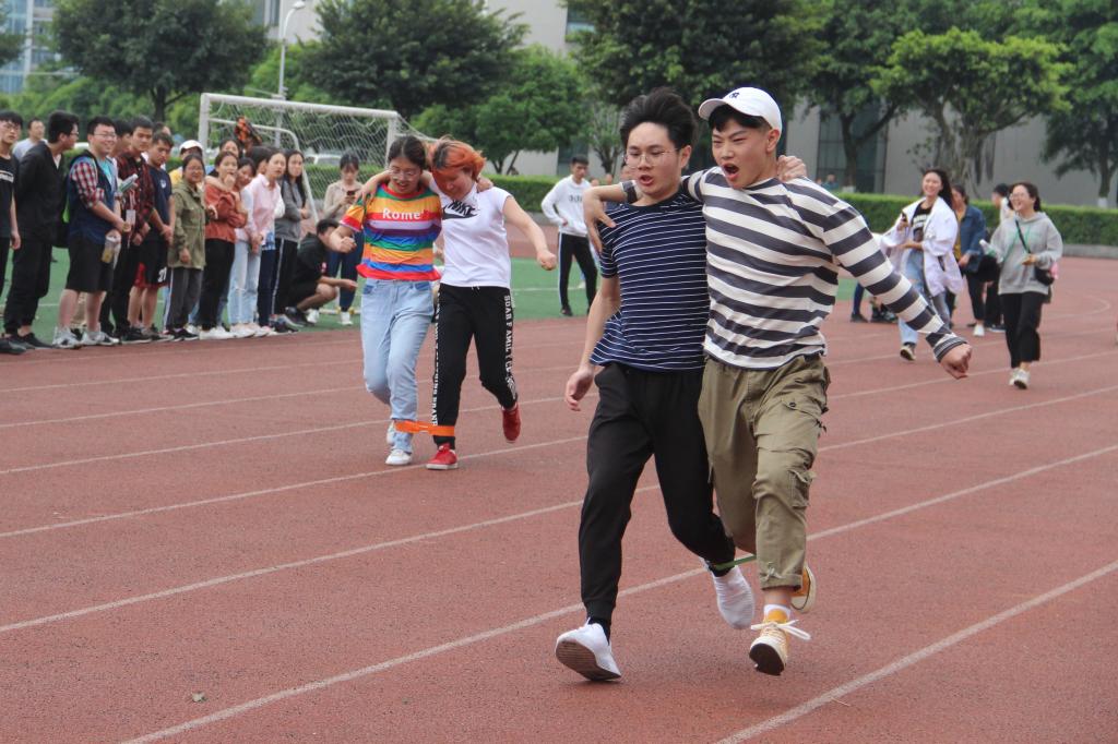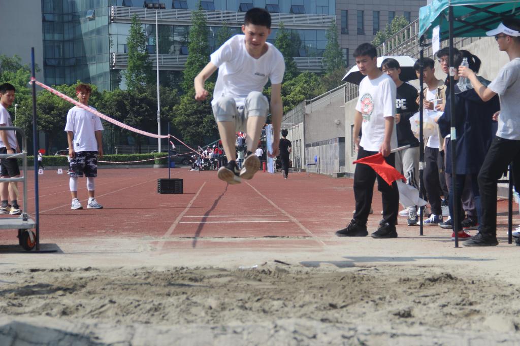本次运动会的比赛项目分为田赛径赛两类,除了常规的100m、200m、400m、800m、4×100m接力、跳远、铅球等个人单项外,还设立了三人两足接力、跳大绳、抛绣球等趣味运动项目。趣味运动项目的进行将整个运动会的氛围推向了高潮。按照比赛规则,两人三足要求两名同学用绑腿将两人相邻的小腿绑住,进行六组五十米的接力赛跑,这对小班同学们的默契度提出了较高的要求,而抛绣球则要求一位同学用嘴叼住纸杯去接住同伴抛过来的乒乓球,既考验接球同学的反应速度,又考验抛球同学的准度。紧张而又激烈的比赛不仅锻炼了各小班的团结协作能力,也增进了同学之间的友谊。
