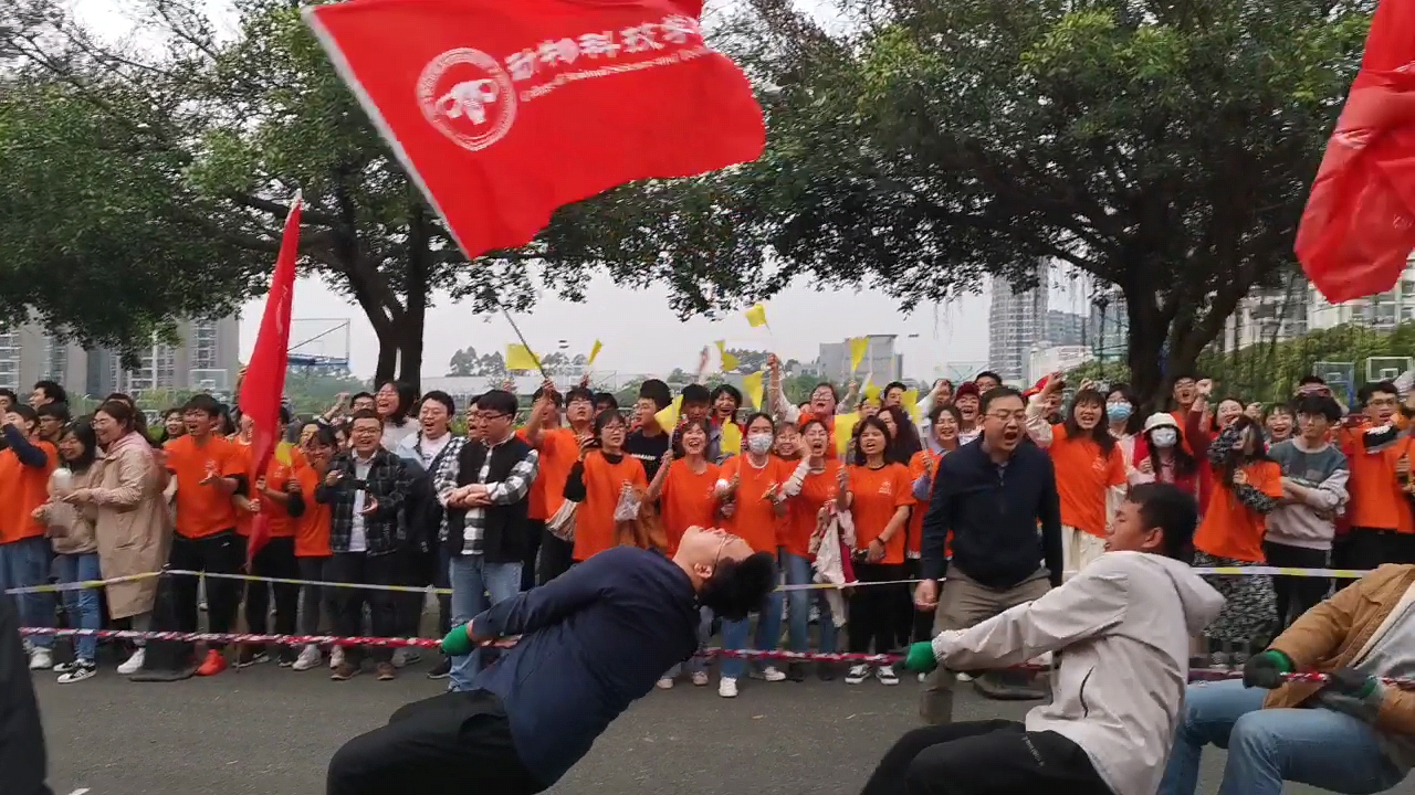 比赛现场,学院拔河队队员们精神抖擞,斗志昂扬,自信地列队备战。身着橙色院服的学院啦啦队队员在赛场两边举起8杆大旗,为拔河队呐喊助威。比赛开始,队员们紧握长绳,团结一心,预想中的拉锯战并未出现,两局均以迅雷之势快速取得胜利。