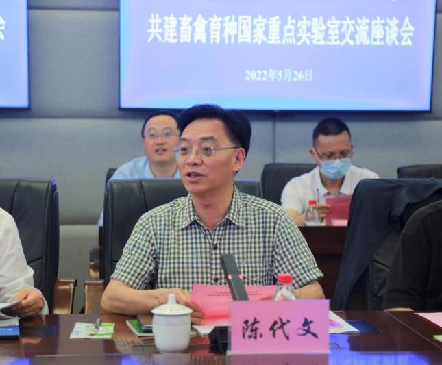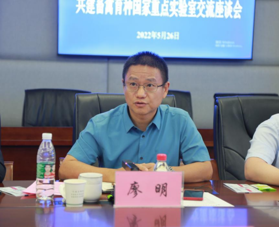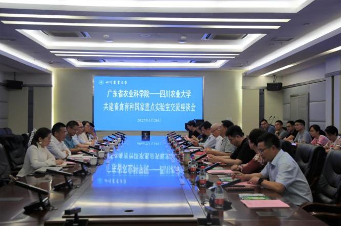5月26日,广东省农业科学院副院长廖明一行来校,开展共建畜禽育种国家重点实验室(重组)交流。校长吴德、副校长陈代文及科技管理处、新葡的京集团8814、动物营养研究所等单位相关负责人及专家教授参加了座谈会。陈代文主持座谈会。双方希望进一步加强合作,携手做好畜禽育种国家重点实验室重组共建。