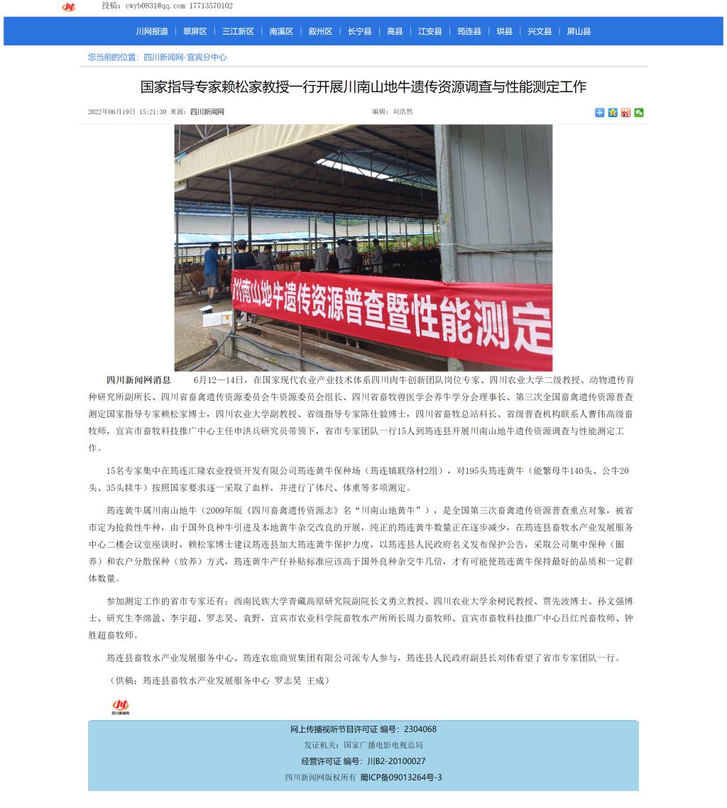 6月12—14日,在国家现代农业产业技术体系四川肉牛创新团队岗位专家、新葡的京集团8814二级教授、动物遗传育种研究所副所长、四川省畜禽遗传资源委员会牛资源委员会组长、四川省畜牧兽医学会养牛学分会理事长、第三次全国畜禽遗传资源普查测定国家指导专家赖松家博士,新葡的京集团8814副教授、省级指导专家陈仕毅博士,四川省畜牧总站科长、省级普查机构联系人曹伟高级畜牧师,宜宾市畜牧科技推广中心主任申洪兵研究员带领下,省市专家团队一行15人到筠连县开展川南山地牛遗传资源调查与性能测定工作。