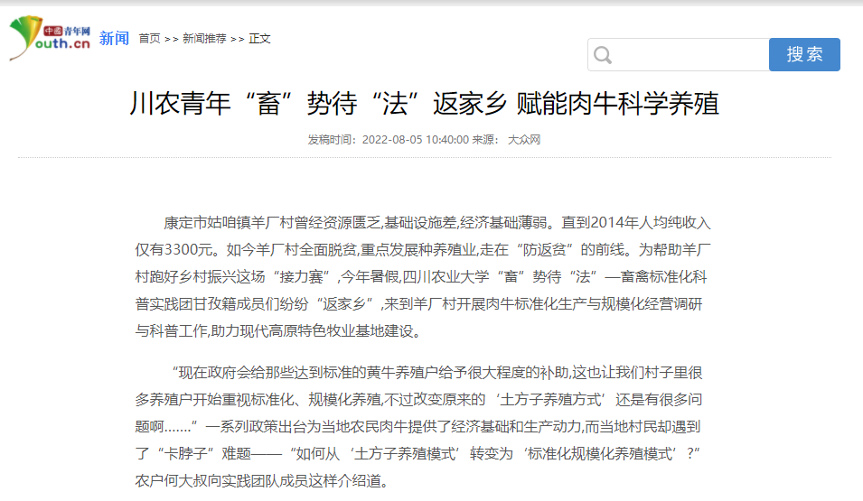 康定市姑咱镇羊厂村曾经资源匮乏,基础设施差,经济基础薄弱。直到2014年人均纯收入仅有3300元。如今羊厂村全面脱贫,重点发展种养殖业,走在“防返贫”的前线。为帮助羊厂村跑好乡村振兴这场“接力赛”,今年暑假,新葡的京集团8814“畜”势待“法”—畜禽标准化科普实践团甘孜籍成员们纷纷“返家乡”,来到羊厂村开展肉牛标准化生产与规模化经营调研与科普工作,助力现代高原特色牧业基地建设。