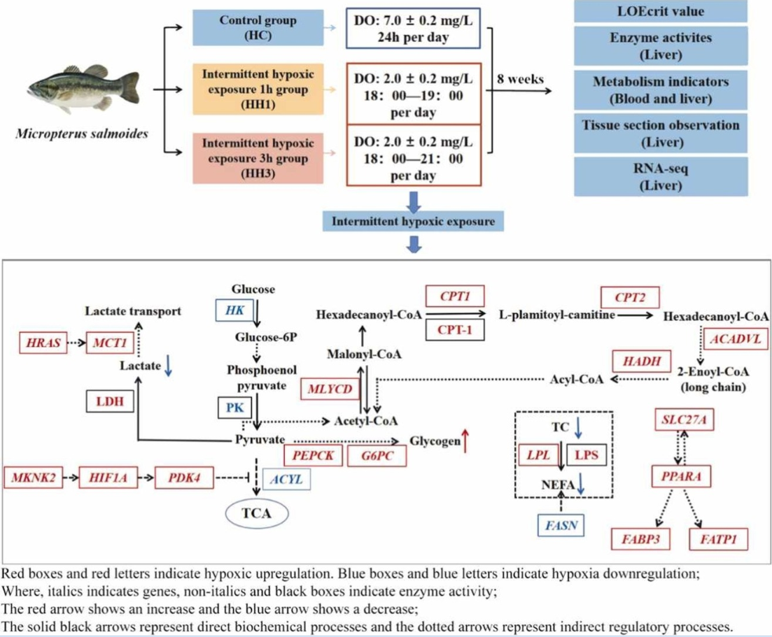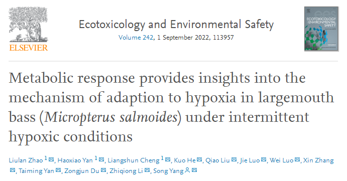 近日,学院杨淞教授团队以新葡的京集团8814为唯一通讯单位在国际知名期刊《Ecotoxicology and Environmental Safety》(IF=7.129,中科院Top期刊),发表了题为《Metabolic response provides insights into the mechanism of adaption to hypoxia in largemouth bass (Micropterus salmoides) under intermittent hypoxic conditions》(间歇低氧条件下大口黑鲈代谢反应为探究其低氧适应机制提供新思路)的研究论文,该研究为了解大口黑鲈适应低氧环境提供了基础资源及新的见解。该研究利用间歇低氧暴露(IHE)模式,模拟自然水生环境中溶氧不稳定,波动大的特点展开。研究发现,IHE显著增强了大口黑鲈低氧耐受能力,其失去平衡的临界溶氧值较对照组相比显著下降。全转录组测序结果显示差异表达的mRNA主要富集在PPAR、脂肪酸代谢和脂肪酸降解等信号通路。结合生化指标分析,IHE促进大口黑鲈肝脏糖异生、乳酸代谢及脂肪酸氧化过程。研究结果表明,IHE可以通过调节大口黑鲈去除厌氧代谢副产物的能力及代谢底物的选择来提高耐低氧能力,其结果也为解决大口黑鲈在集约化水产养殖中重要胁迫因素—低氧,提供了新的见解。