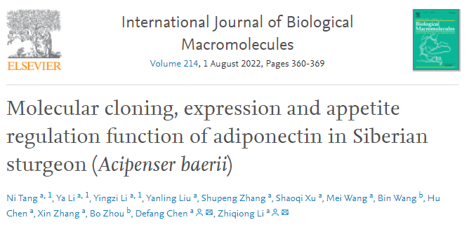 近日,李志琼教授团队博士后唐妮在国际知名期刊《International Journal of Biological Macromolecules》(中科院1区TOP期刊,IF=8.025)发表了题为《西伯利亚鲟脂联素分子克隆、表达和食欲调节功能》(Molecular cloning, expression and appetite regulation function of adiponectin in Siberian sturgeon (Acipenser baerii))的研究论文。