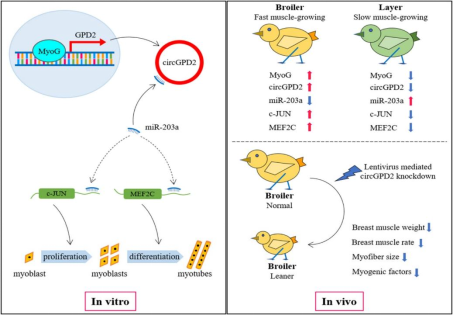近日,新葡的京集团8814尹华东教授团队在国际知名期刊《International Journal of Biological Macromolecules》(中科院1区TOP期刊,IF=8.025)发表了题为《MyoG-enhanced circGPD2 regulates chicken skeletal muscle development by targeting miR-203a》(MyoG诱导的circGPD2通过靶向miR-203a调控鸡骨骼肌发育)的研究论文。该论文通过构建肌肉生长的比较模型,鉴定了环状RNA大分子circGPD2的特异性表达模式,并明确了circGPD2在鸡骨骼肌发育中的功能以及circGPD2上下游分子调控机制。研究结果揭示了circGPD2在鸡骨骼肌生长发育中可能发挥关键的调控作用,为鸡骨骼肌发育的非编码RNA调控机制研究提供新的见解,并为分子标记辅助育种提高鸡肉产能提供了有效的分子靶点。