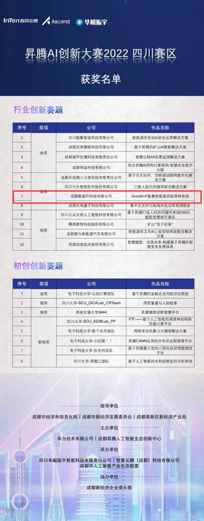近日,由成都市经济和信息化局、华为技术有限公司、成都昇腾人工智能生态创新中心等联合举办的昇腾AI创新大赛2022四川赛区决赛圆满落幕。通过激烈角逐,我校动科学院在读博士杨喜堤所负责的成都聚源丹科技有限公司的《DeepBLUP畜禽智能基因组育种系统》荣获行业创新赛题银奖。