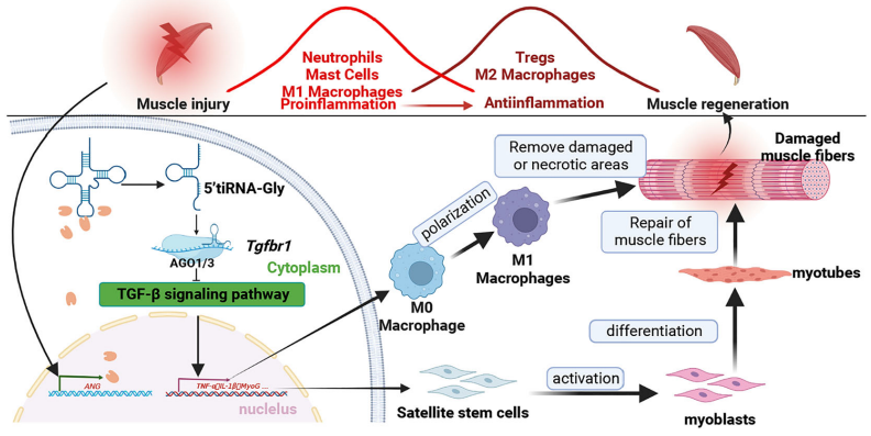 仔猪宫内发育迟缓(Intra-Uterine Growth Restriction, IUGR)引起的高死亡率和发病率是制约我国生猪产业的一大“瓶颈”。据统计,在我国有15%-20%的新生仔猪是IUGR个体,约75%的IUGR仔猪会在断奶前死亡,断奶存活的IUGR仔猪普遍存在生长缓慢、饲料利用率低和肉品质差等生理缺陷,给养猪生产造成巨大的经济损失。IUGR引起的猪肌肉组织代谢缺陷综合征是农业领域的重大研究热点。朱砺教授团队长期从事IUGR猪形成的遗传机制研究,继2022年12月首次报道了IUGR猪肌肉的tRFs转录图谱,构建了猪肌肉代谢相关的分子调控网络(Frontiers in Physiology,PMID: 36388094)后,本研究进一步挖掘了一个可参与肌卫星细胞激活、肌细胞增殖分化以及肌肉再生的关键调控因子5'tiRNA-Gly-CCC。通过肌肉损伤模型发现,该tRFs与肌肉的损伤程度和炎症的发生密切相关。系统的细胞与活体实验表明,5'tiRNA-Gly-CCC能够通过靶向Tgfbr1信号通路促进肌肉损伤早期巨噬细胞向M1型极化,并激活肌卫星细胞,同时参与对肌细胞的增殖和分化调控。该研究不仅为猪产肉量的分子选育提供了新的分子标记,也为人类肌肉疾病相关研究提供了新的研究方向。
