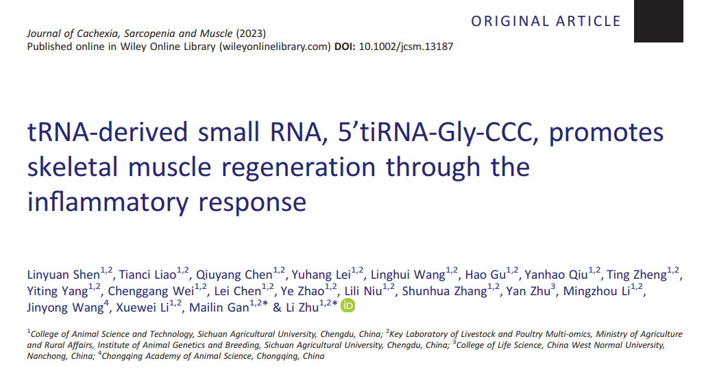 近日,学院、猪禽种业全国重点实验室、畜禽生物组学农业部重点实验室、畜禽遗传资源发掘与创新利用四川省重点实验室朱砺教授团队在肌肉研究领域国际顶级期刊Journal of Cachexia, Sarcopenia and Muscle (中科院大类一区TOP,IF=12.063)在线发表了题为(tRNA-derived Small RNA, 5'tiRNA-Gly-CCC, Promotes Skeletal Muscle Regeneration Through the Inflammatory Response)(tRNA衍生的小非编码RNA通过炎症应答促进骨骼肌再生)的研究论文,该论文报道了肌肉组织中一种来源于tRNA碎片(tRFs)的新型表观遗传调控因子,其可以通过巨噬细胞促炎性极化增强肌肉的再生能力。