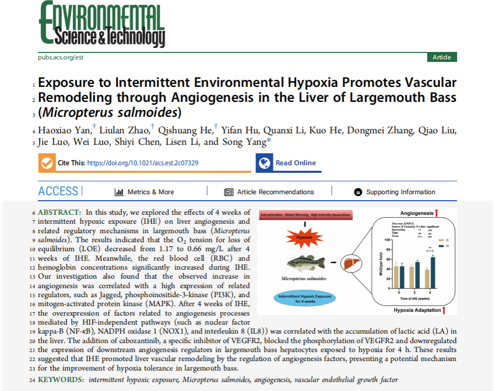 近日,学院杨淞教授团队以新葡的京集团8814为唯一通讯单位在自然指数期刊《Environmental Science & Technology》(N1级中科院大类一区TOP,IF=11.357)发表题为“Exposure to Intermittent Environmental Hypoxia Promotes Vascular Remodeling through Angiogenesis in the Liver of Largemouth Bass (Micropterus salmoides)”的研究论文。该论文报道了血管内皮生长因子受体2(VEGFR2)是重要的低氧调控因子,其通过调控血管新生促进大口黑鲈肝脏血管重塑进而增强低氧耐受能力。