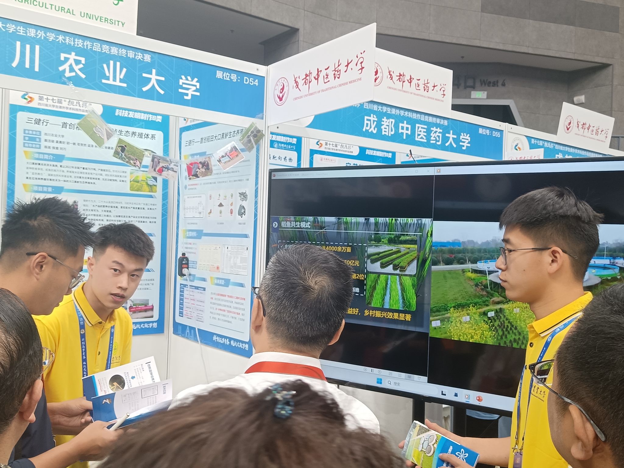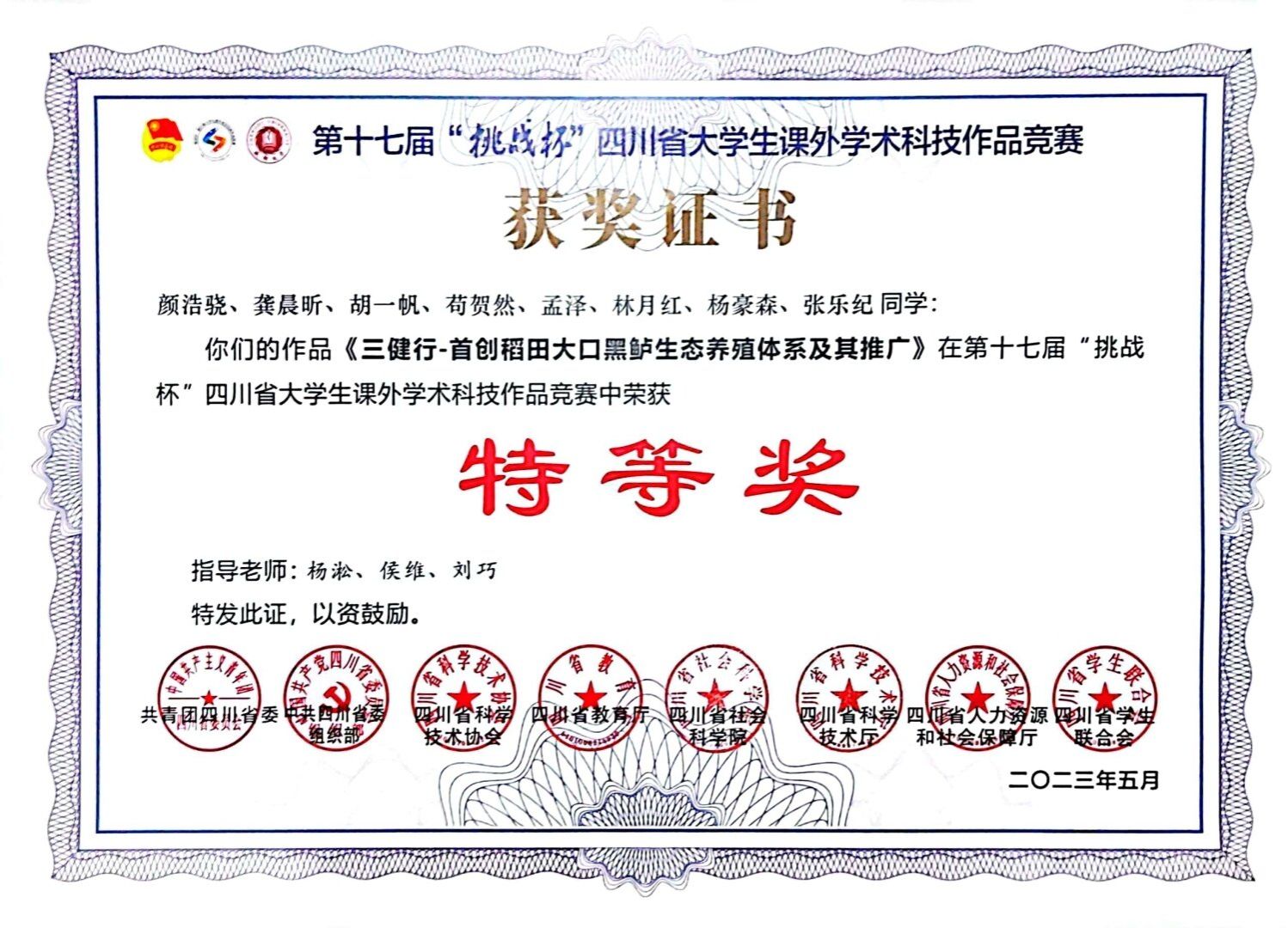 5月14日-16日,第十七届“挑战杯”四川省大学生课外学术科技作品竞赛在成都大学举行。学院副院长杨淞教授、校团委副书记侯维老师和学院刘巧博士指导,学院硕士研究生颜浩骁带队,水产养殖专业本科生龚晨昕、胡一帆、苟贺然、孟泽、林月红、杨豪森、张乐纪8位同学参与的《三健行——首创稻田大口黑鲈生态养殖体系及其推广》获评特等奖,实现学院“挑战杯”四川省大学生课外学术科技作品竞赛类奖项的突破,得到与会专家评委的高度关注与肯定。