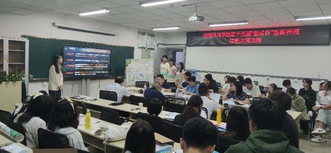 第十五届“德成杯”畜禽养殖技能大赛共分三轮,历时3个月,分为初赛、复赛、决赛三个阶段。四百多名同学参加专业基础知识初赛笔试,104名同学进入复赛,通过跨年级组队,4人一组参加复赛。复赛为“猪精液品质鉴定及精子密度计数”和“制备蛙类坐骨神经-腓肠肌标本”两项专业实验技能操作严格考核,11支队伍进入最后的决赛。决赛形式为根据家乡特色优势及专业特点,设计一个“生态健康”的畜牧场规划。经过PPT陈述、图纸展示、评委提问等环节。