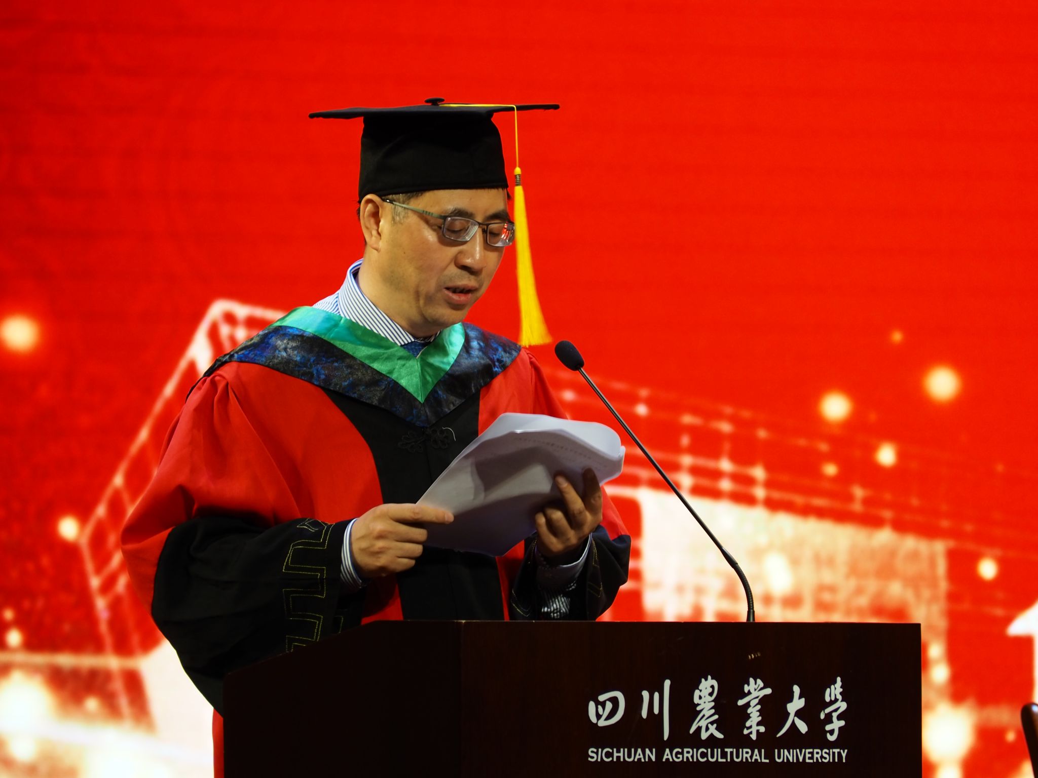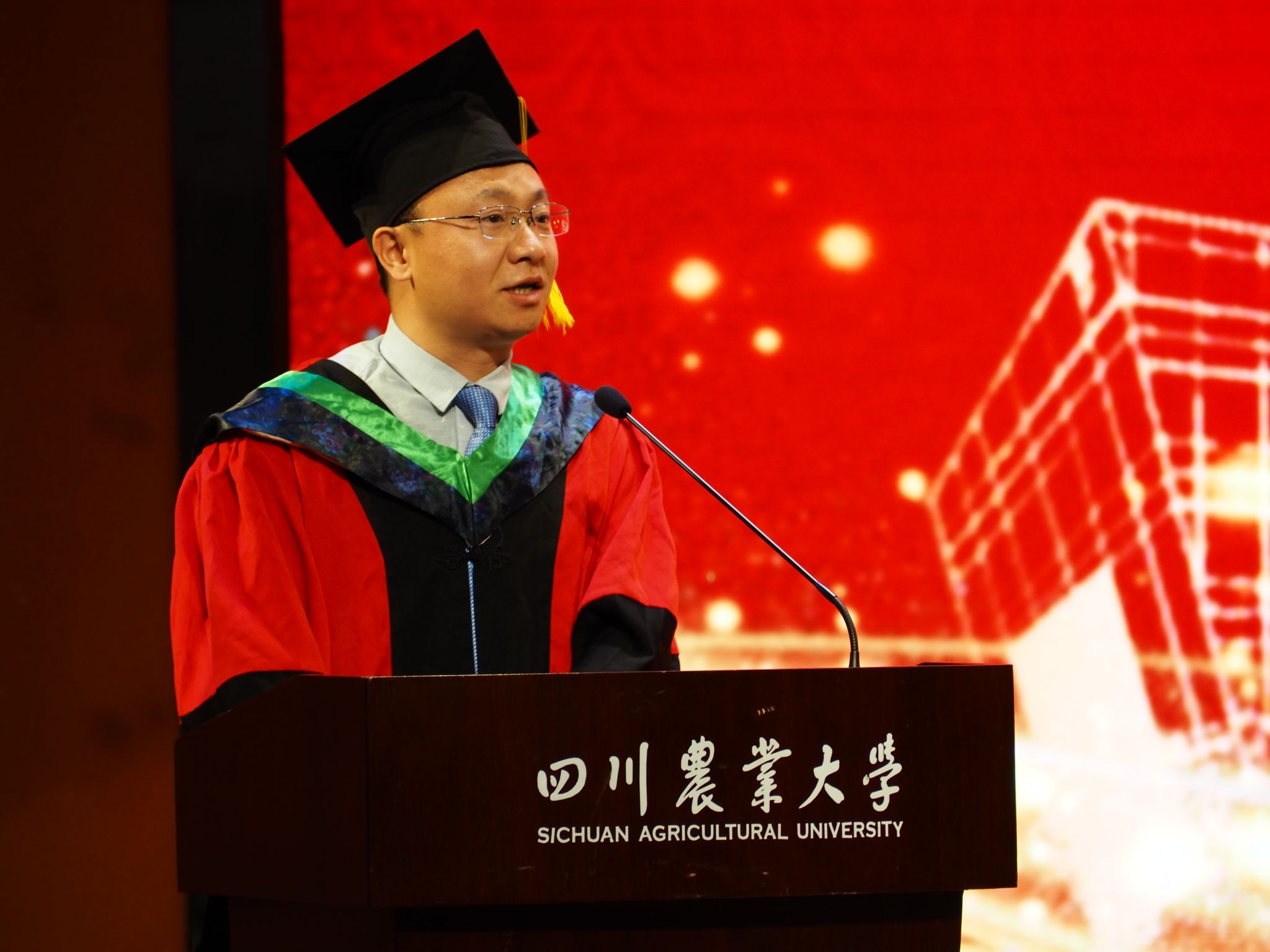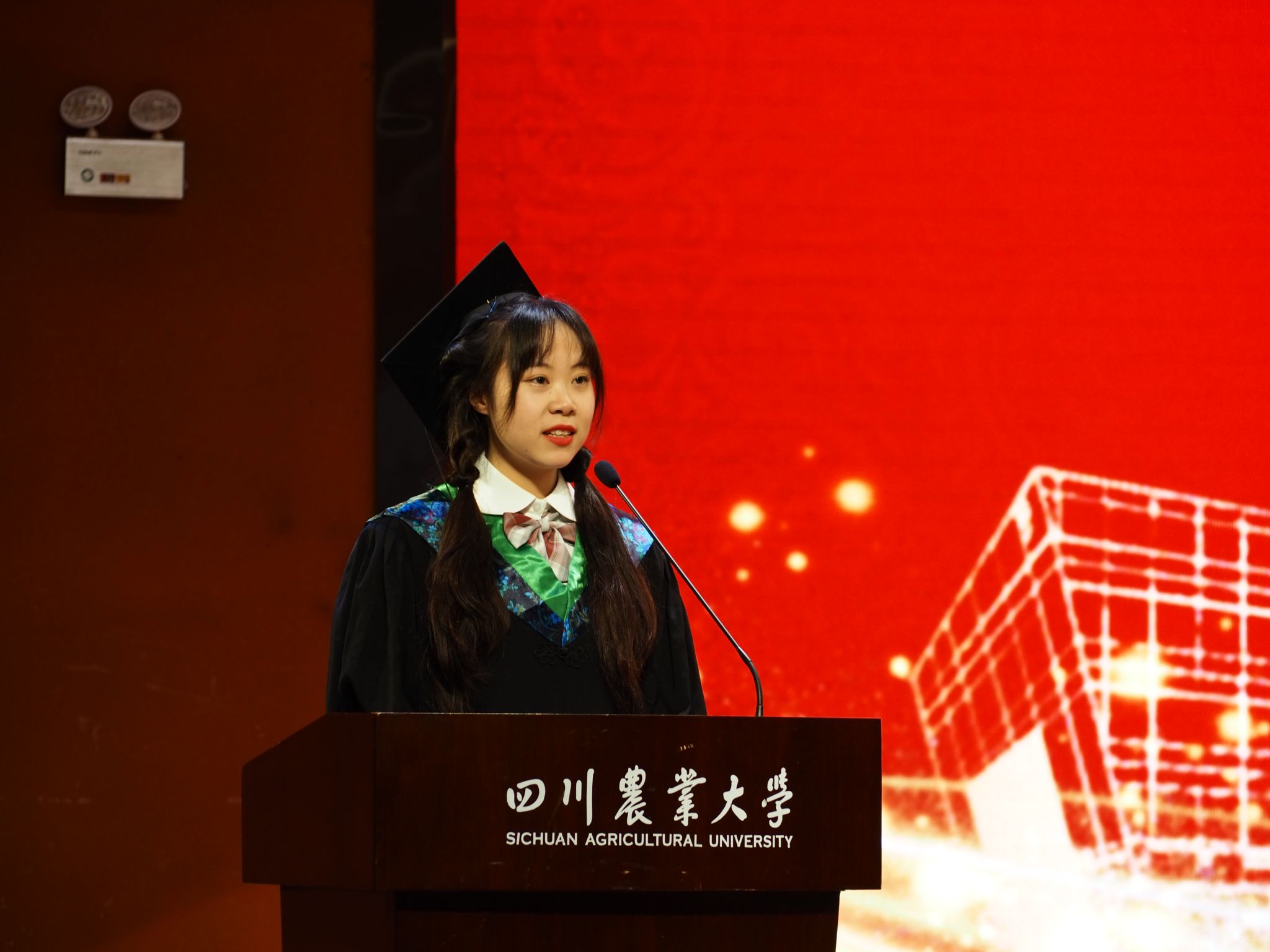 动物科学2019级5班朱磊作为毕业生代表发言。他回顾了在川农大求学的四年来学校的巨大变化,表达了对学院、对老师以及同学们的感谢之情,为一起毕业的同伴们送上最真诚的祝福。