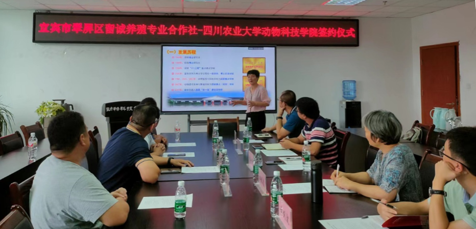 8月18日下午,宜宾市农业农村局申洪兵研究员、翠屏区农业农村局动物疫病预防控制中心主任龚一水、金秋湖镇农业技术服务中心副主任曾明和翠屏区留诚养殖专业合作社理事长陈伟等一行到访学院,学院副院长赵小玲教授、杜晓惠教授、动物医学院禽病专家舒刚副教授、乡村振兴学院社会服务科蒋攀副科长和黄剑波博士,以及学院10余位家禽方向的研究生参加会议。