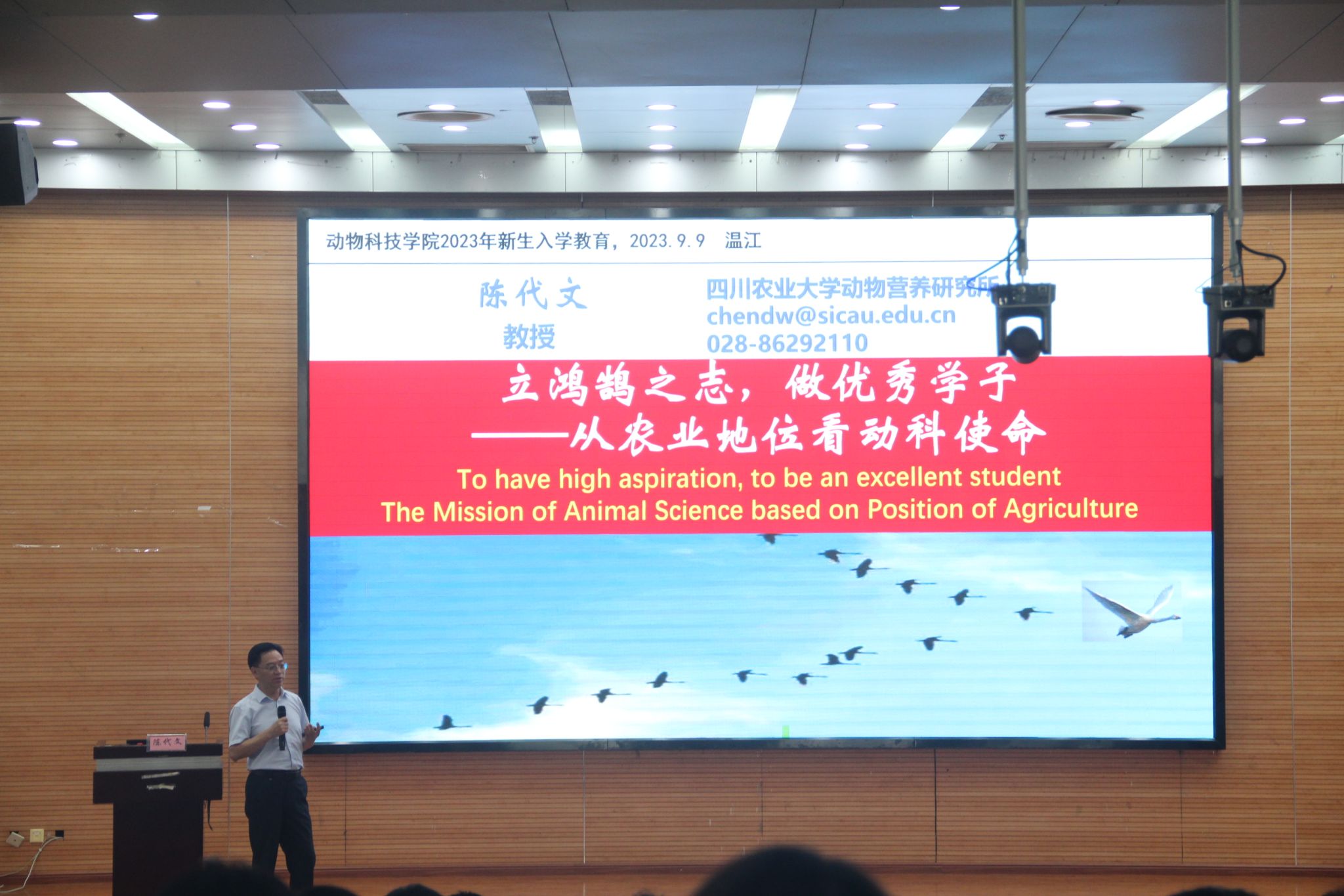 陈代文教授从“什么是大学”、“川农大是什么样的大学”开场,以《从农业地位看动科使命》为题,通过分析农业科学与生命科学、资源环境科学、健康学等学科关系,结合国际社会转型面临的资源、人口、环境、疾病等诸多问题,详细讲述了农业现代化是实现中国梦的前提和基础,介绍了现代畜牧业是最复杂的高新技术产业,未来畜牧业是自动化、智能化的产业,发展现代畜牧业“一靠人才,二靠科技,根本靠教育”。他寄语同学们,要胸怀国之大者,努力成人成才;做好人生规划,明确奋斗目标;不断锤炼三观,善于做人做事;潜心钻研业务,全面提升技能,努力成为立大志、明大德、成大才、担大任的时代新畜科人。