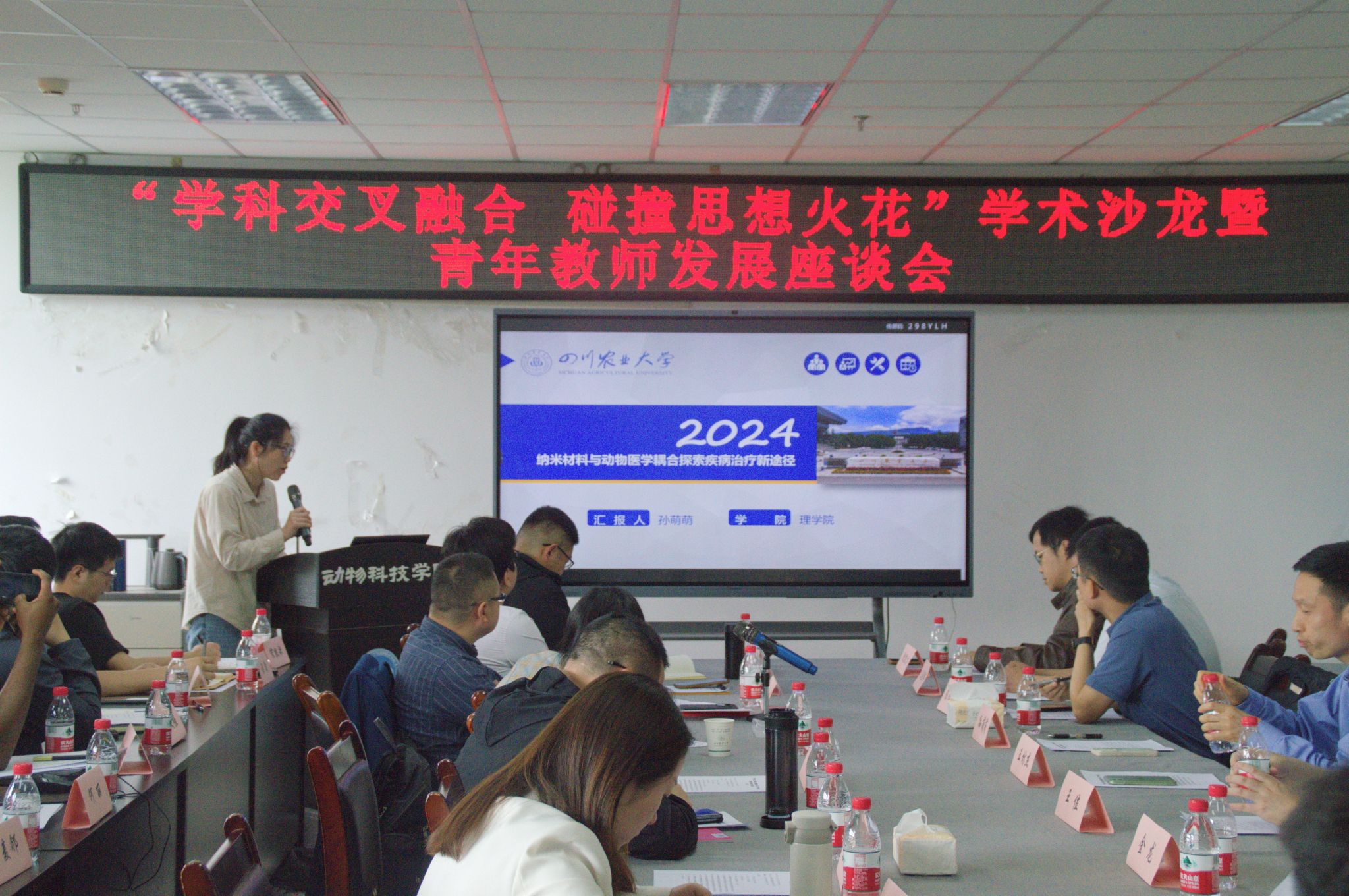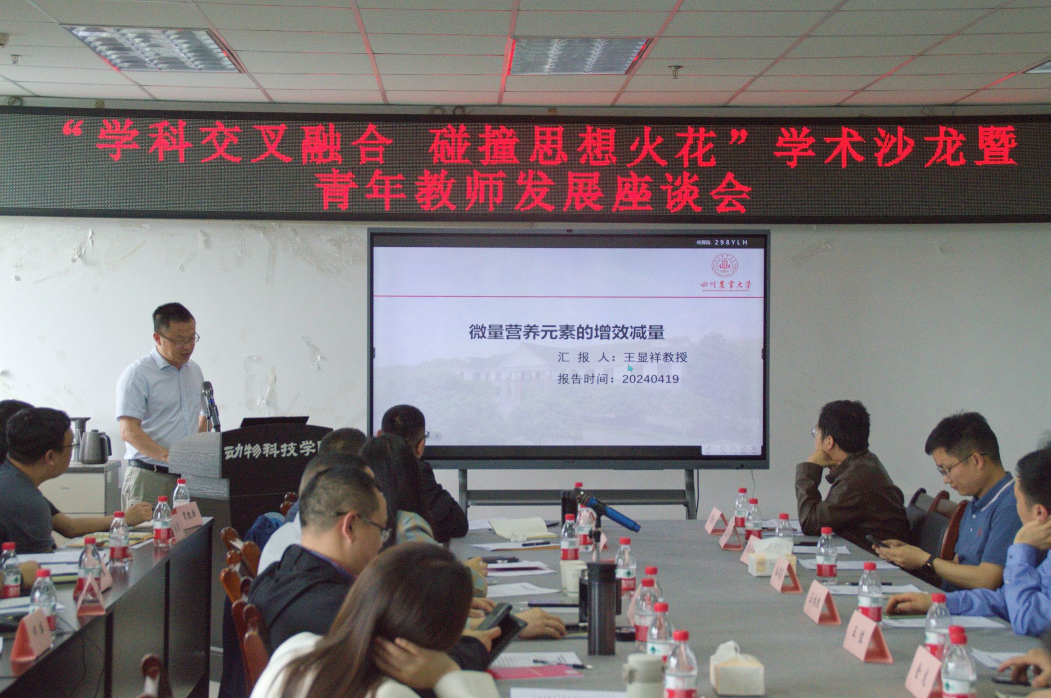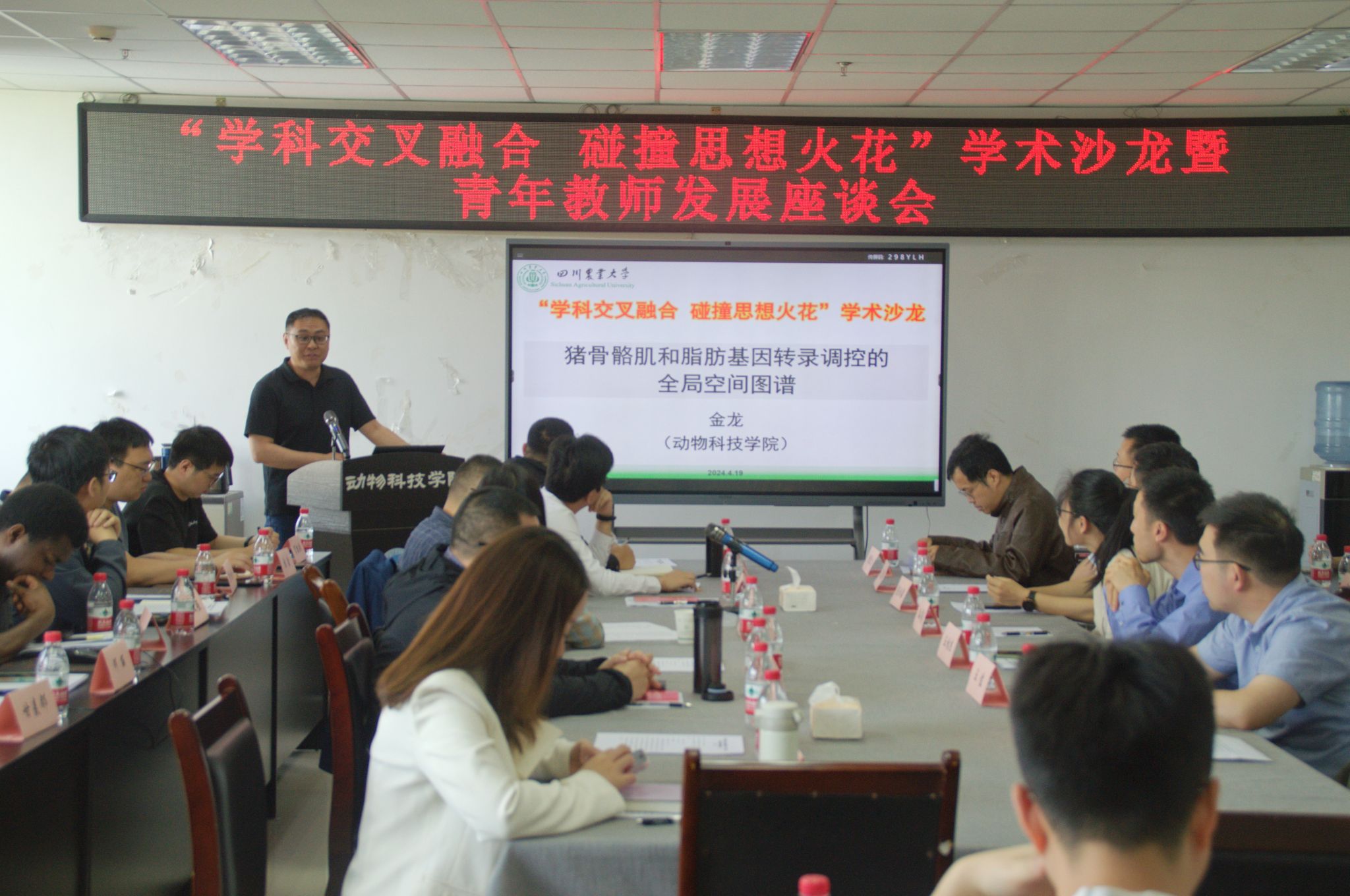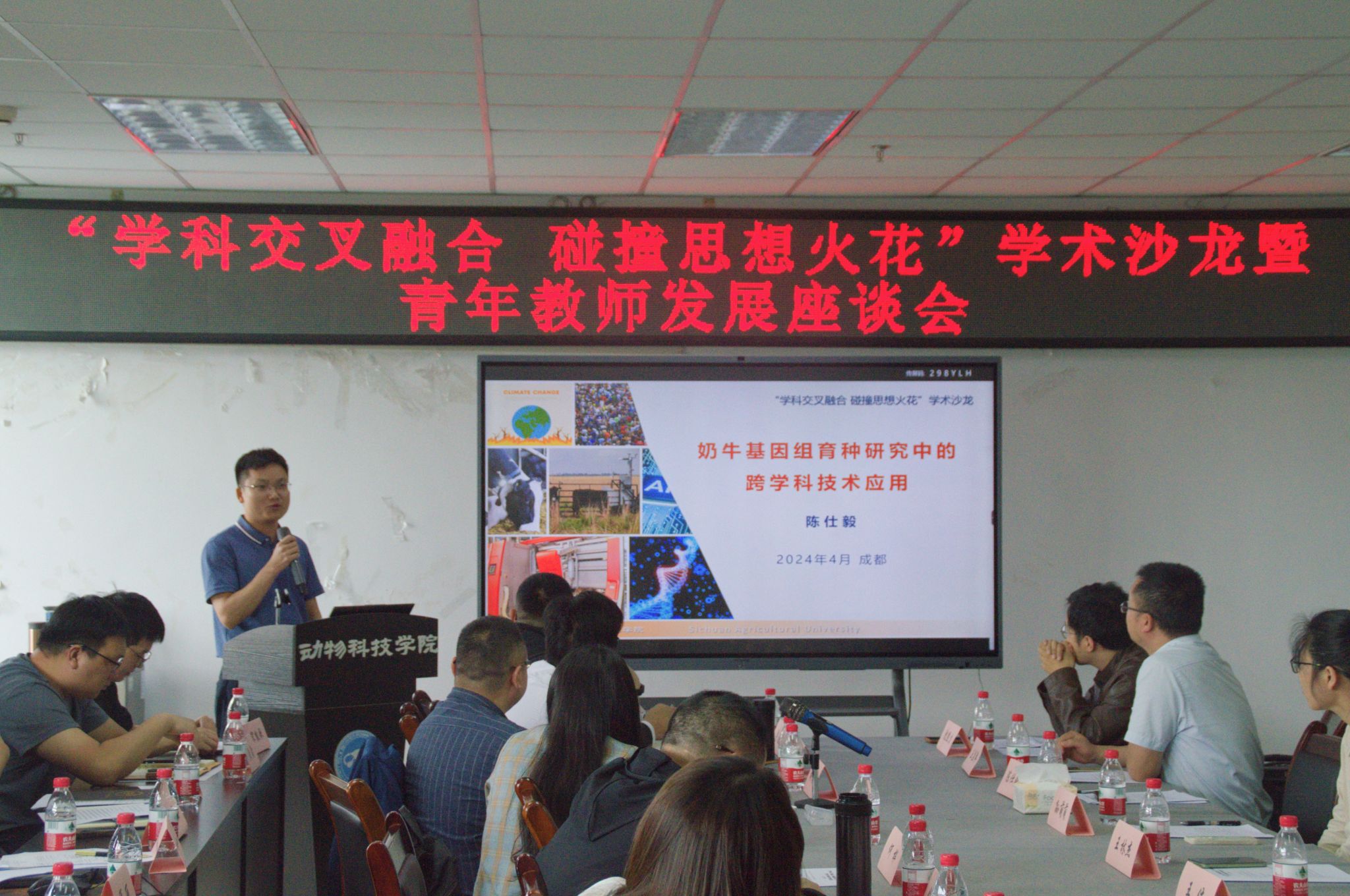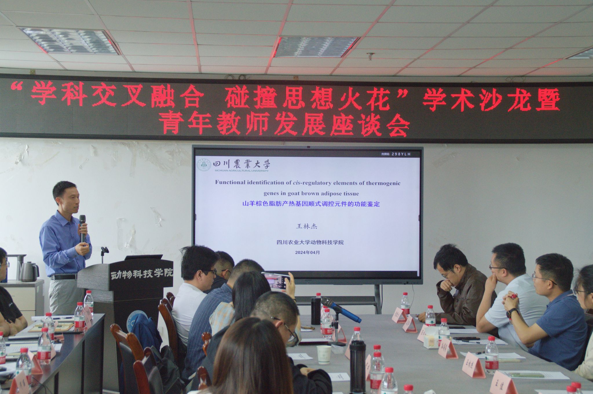 座谈环节,与会人员聚焦“推进学科交叉融合,助力青年教师成长”主题,围绕如何加强跨学科、跨学院、跨领域的协同研究,实现资源共享、优势互补,促进动物遗传育种与繁殖学科、水产学科与基础学科深度交叉融合,推动学术交流与创新开展交流探讨,气氛热烈。交流中,漆雁斌勉励青年教师积极开展学科交叉融合,推进科研创新,进一步明晰个人学术生涯规划,通过立足立德树人塑造师德师风,立足教学科研锻造业务本领,立足川农大平台干事创业,不断增强自身硬实力和软实力。江舟、杜俊波分别结合研究生培养、科研项目申报等方面分享自己的经验和见解。
