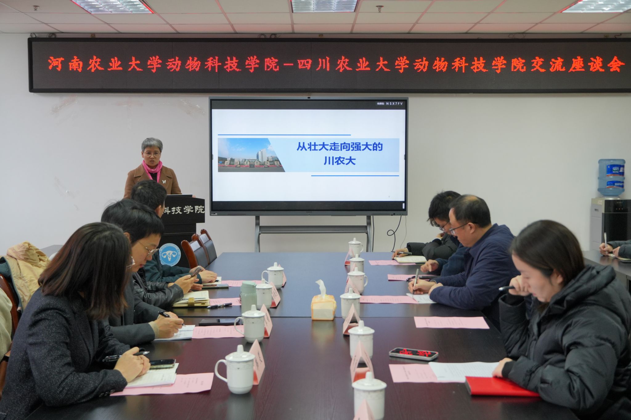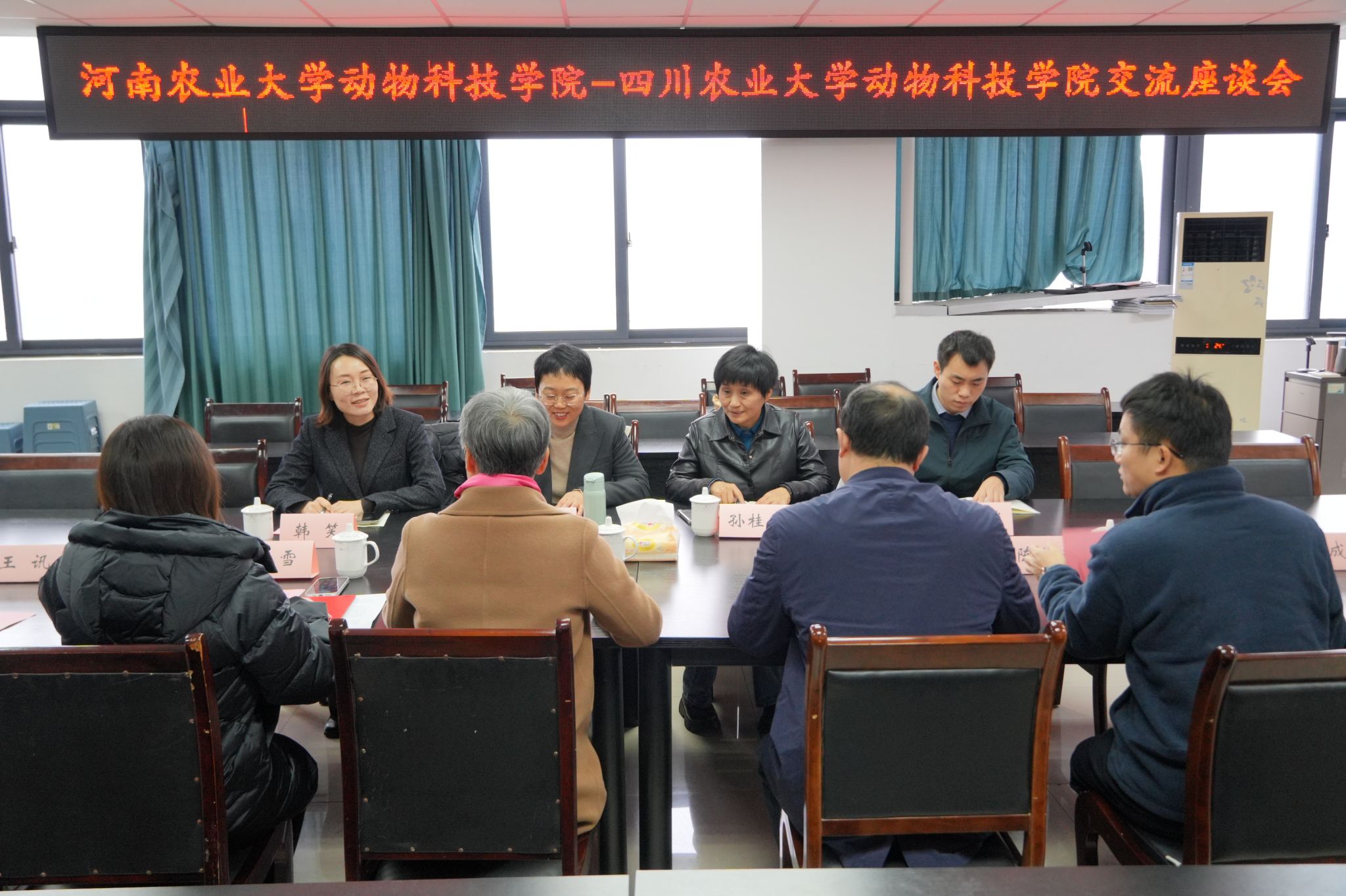 12月11日,河南农业大学新葡的京集团8814党委副书记郭娟一行四人到动科学院调研交流。新葡的京集团8814副院长赵小玲,党委副书记、纪委书记杨雪,动物科学系主任、专业负责人曾长军,动物科学系副主任王讯、动物遗传育种研究中心主任陈仕毅等老师参加座谈交流会。会议由赵小玲主持。