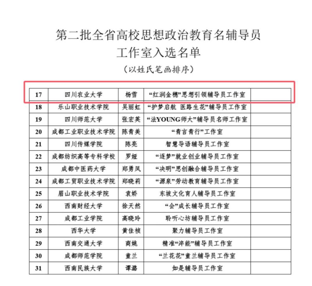 近日,四川省教育厅公布了第二批高校思想政治教育名师工作室立项情况,新葡的京官网党委副书记、纪委书记杨雪主持的“‘红润金穗’思想引领辅导员工作室”成功入选。这是新葡的京官网首次实现“省级名辅导员工作室”立项建设。