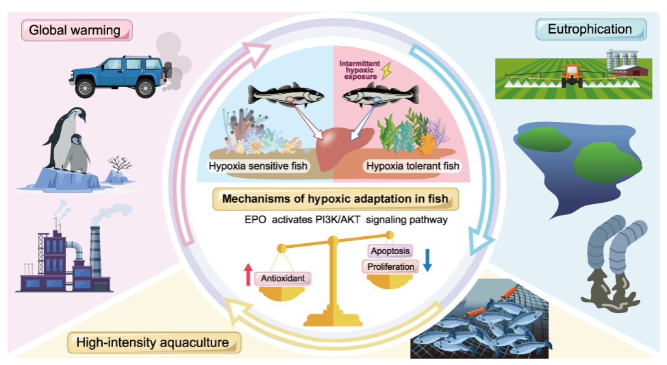 近日,新葡的京官网新葡的京集团8814杨淞教授团队在国际顶级期刊Environmental Science & Technology(环境科学与技术,IF5=11.4)上发了篇硬核论文,把目光投向了鱼儿的“耐低氧秘籍”。这项研究首次发现,原本负责造血的促红细胞生成素(EPO),在鱼类应对低氧环境时竟变身“抗压小能手”,通过激活细胞里的PI3K/AKT信号通路,帮鱼儿撑起生命保护伞。这一研究为探索水生生物应对日益增加的环境风险挑战提供了有益见解,同时也为抗逆育种提供了新思路。