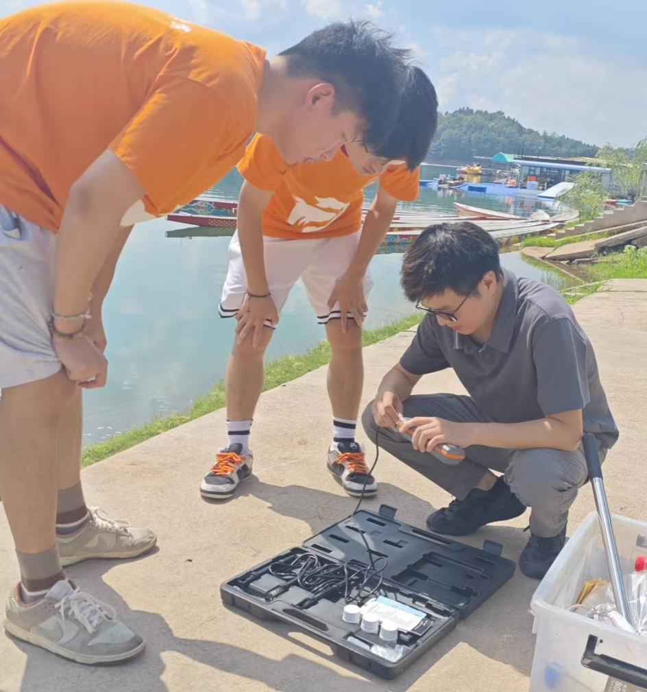 随后实践团开展实地水质检测与分析工作。团队成员分工协作,对养殖水域进行多点位采样,重点监测溶解氧、pH值、氨氮含量、亚硝酸盐浓度等核心指标,并通过便携式检测设备与实验室分析相结合的方式,确保数据精准性。“水质是水产养殖的‘生命线’,当前园区部分水域氨氮值略高于标准值,可能与投喂量控制、底泥清理频率有关。”宋凯歌副教授指出。通过实地调研,团队发现园区虽已建立基础水质管理体系,但在动态监测、数据应用等方面仍存在提升空间。调研结束后,团队整理形成《仙海湖园区水质检测报告》,为后续管理优化提供科学依据。