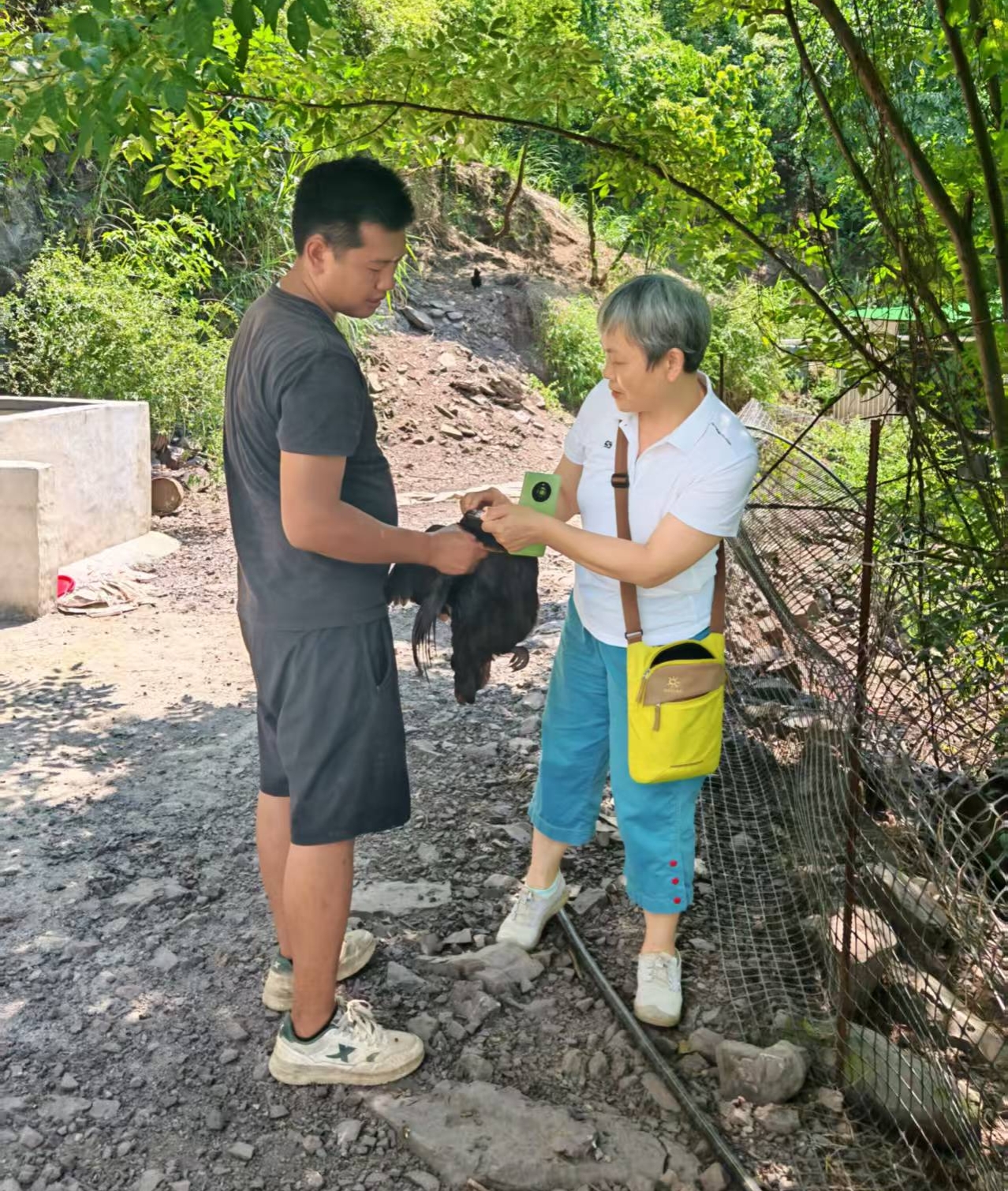 此外,杜晓惠在陈云峰陪同下,实地考察了桐梓林生态农场位于山腰的乌鸡放养基地(图3)。针对负责人张权面临的粗放式管理、野生动物损耗及出栏率偏低等问题,现场提供了产蛋箱改进思路,并表示后续可在品种选育和饲养管理上给予具体指导。