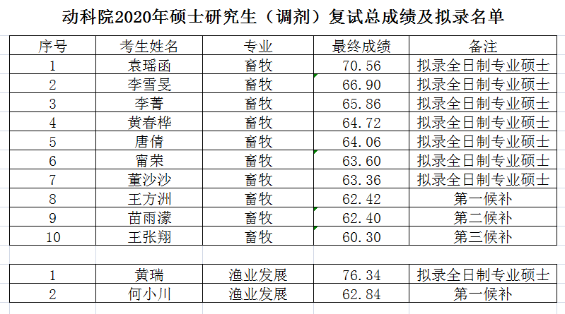 2020年6月2日,在新葡的京集团8814研究生招生工作领导小组指导下,畜牧和渔业发展专业顺利完成硕士调剂远程复试工作,现将参与复试考生的总成绩及拟录取情况进行公示,公示期为2020年6月3日-6月12日。如对结果有疑问或异议,请向学院研究生招生工作领导小组反映,也可联系学科进行咨询和核实。