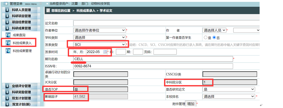 1学术成果参照学校科技管理处及相关部门的认定结果。以教师在新葡的京集团8814科技管理系统内录入后审核通过的结果为准,未录入或审核的以教师在科技管理系统内查询结果(川农科技管理系统查询示意图,仅教师可查)。