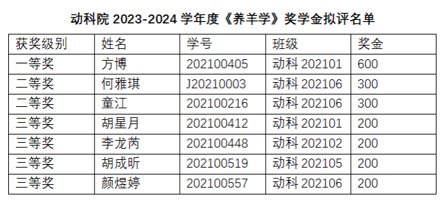 根据刘相模先生设置的《养羊学》课程奖学金的相关要求,参考《羊生产学》课程考核等结果,现将刘相模《养羊学》奖学金拟评结果公示如下,如有异议,请于9月30日前实名到7-10-05办公室或者致电(028-86290077)反映。