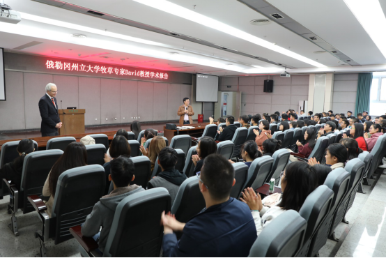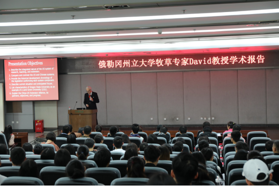 David教授系统地讲解了美国科学研究、教育和推广体系的结构构成及学习方式方法,并以俄勒冈州立大学发展为例,生动形象地讲授了牧草在社会地位的重要性,及美、中高等教育体系的差异,并对学生申请美国研究生教育提供了一定的信息和指导。David教授强调了农业推广在大学中的重要性,呼吁教学、研究一定要理论结合实际,学会与他人合作,共同谋求发展的理念。