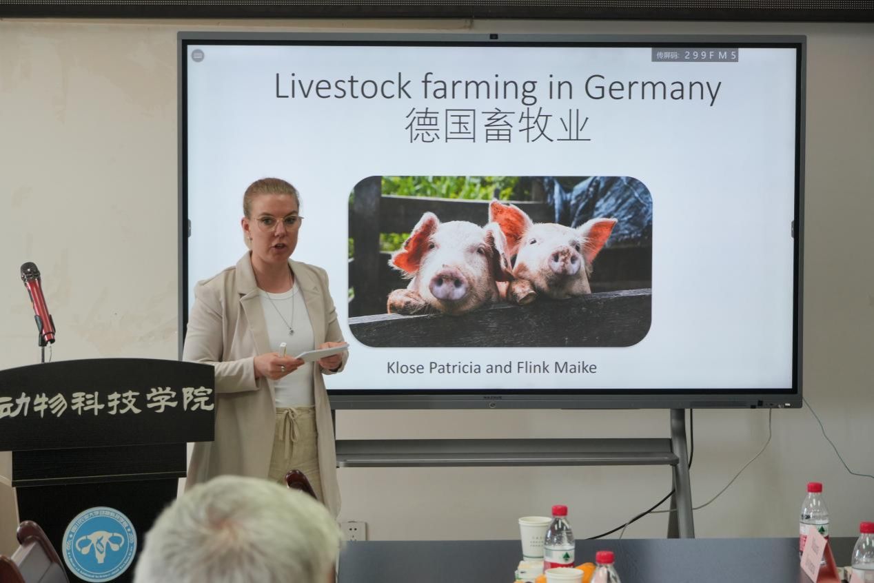 随后,德国师生团成员分别围绕《The German Healthcare System德国医疗卫生系统》《Livestock farming in Germany德国畜牧业》《Cultural student life学生的文化生活》《Pet ownership in Germany德国的宠物饲养情况》等四个方面进行了交流分享。学校动科学院的四名同学分别围绕《川农大精神的内涵》《动科和水产专业介绍》《中华武术、美食、茶文化》《川农学生文化生活》作全英文交流分享。