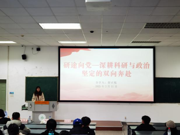 党委办公室副主任、团委副书记舒正悦以“研途向党—深耕科研与政治坚定的双向奔赴”为题,结合学院研究生党员发展要求,深入浅出地为同学们阐述了成为一名优秀党员应具备的素质和能力,鼓励大家在追求学术科研的同时也要积极投身学生工作、社会实践、志愿服务、创新创业、学术交流等,争做一名全面发展的优秀研究生。