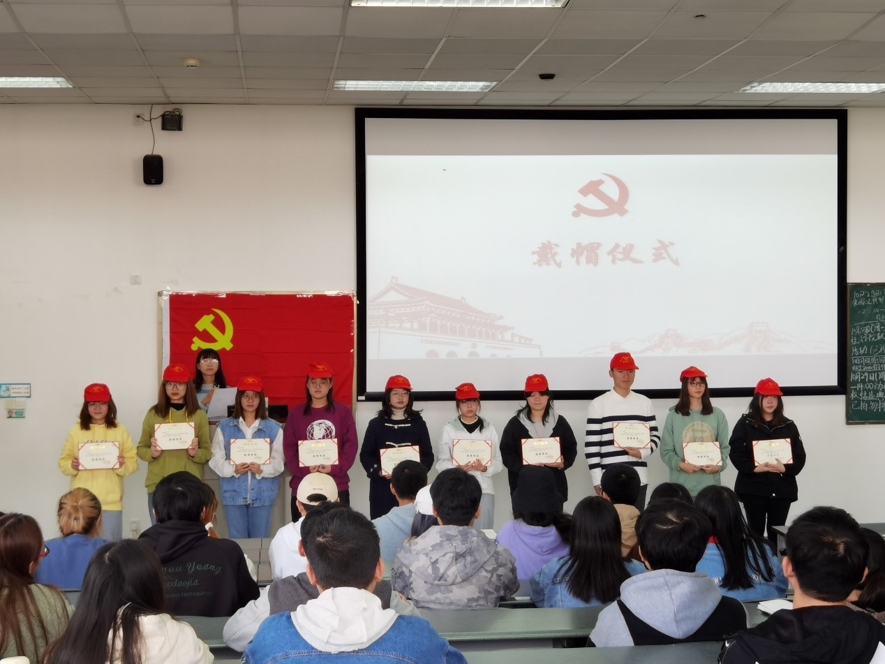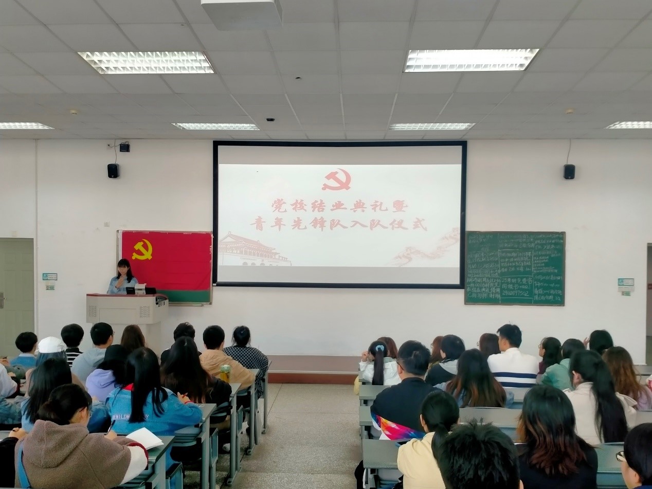 党的精神始终引领入党积极分子们前进,在一个多月的党校学习过程中,大量的学员脱颖而出,在党校结业典礼上,优秀学员代表毛越同学和叶修文同学从入党动机和学习心得两个方面阐述了党校学习的成果,表达了自己入党的决心,并号召全体入党积极分子自觉学习,端正动机,提升思想,积极向党组织靠拢,做一个有志气、骨气、底气的中国青年。随后,青先队员为党校优秀学员颁发结业证书并进行入队戴帽仪式,青年先锋队大队长陈娜娜带领新队员宣读入队誓词。了解青先规范是作为青先队员必要要求,青年先锋队成员周成婉分别从青先纪律、推优入党基础要求和青先积分细则三个方面向新队员介绍了青先相关事宜,并强调了其重要性。