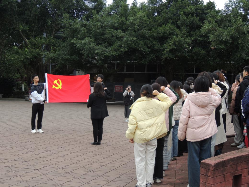 在建川博物馆中流砥柱馆前的红色广场上,气氛庄严肃穆。全体党员整齐列队,面向鲜红的党旗,神情肃穆,举起右拳,共同重温入党誓词。杨雪带领大家庄严宣誓,誓言一字一句,掷地有声,响彻整个广场,表达了全体党员对党的无限忠诚和坚定信念。