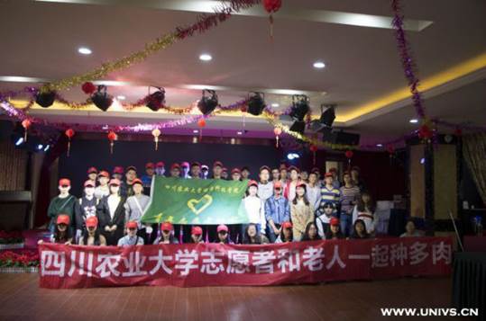 “一玉口中国,一瓦顶成家,都说国很大,其实一个家……”激昂的歌声从四川省“康馨缘”老年公寓传出。这是川农志愿者慰问探访老人家的场景。