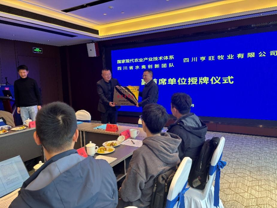 随后,专家团队前往苍溪县四川亨旺牧业有限公司永宁肉鹅育种基地进行考察指导,围绕该基地肉鹅“育繁推”全产业链建设进展、天府肉鹅系列配套系选育与示范推广、“公司+基地+合作社+农户”合作模式探索与实践、旱养种鹅关键技术等进行全面交流和指导。围绕“加速推进苍溪水禽科技与产业创新融合发展”主题,与广元市农业科学研究院、苍溪县农业农村局、苍溪县科技局和企业相关人员进行了座谈交流。会后举行了“四川水禽创新团队副首席单位”授牌仪式。
