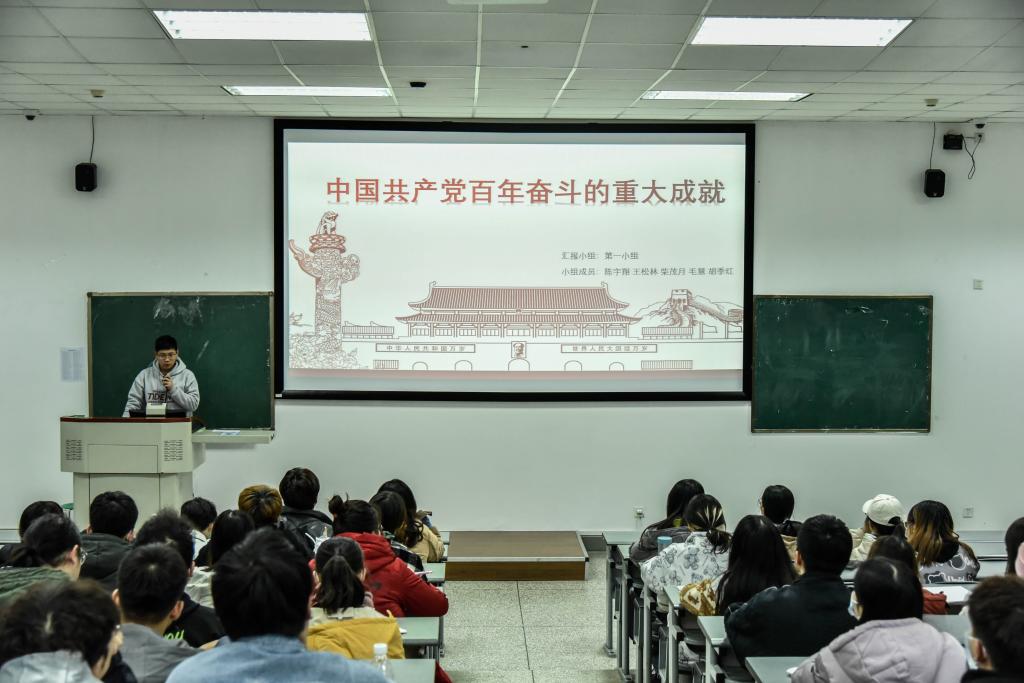 宣讲团成员陈宇翔同学从夺取新民主主义革命伟大胜利、完成社会主义革命和推进社会主义建设、进行改革开放和社会主义现代化建设和开创中国特色社会主义新时代四个方面介绍中国共产党百年奋斗的重大成就并着重指出了中华民族迎来了从站起来、富起来到强起来的伟大飞跃这一巨大成就。