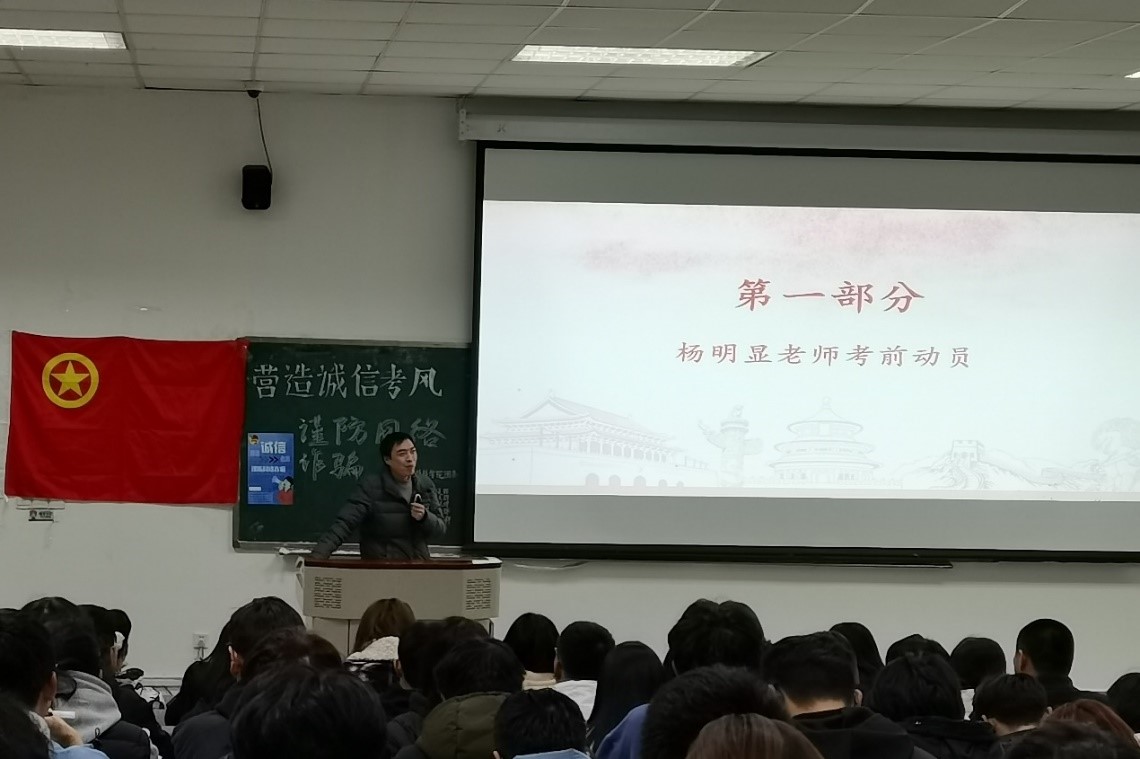 动科202004小班班主任杨明显老师首先为大家作考前动员,鼓舞斗志,点燃同学们奋战四六级和期末考试的斗志,拼搏的激情和动力。“考试成绩的高低是能力的体现,是否诚信应考反映的是学生的道德品质问题。“杨老师严肃的提醒道。
