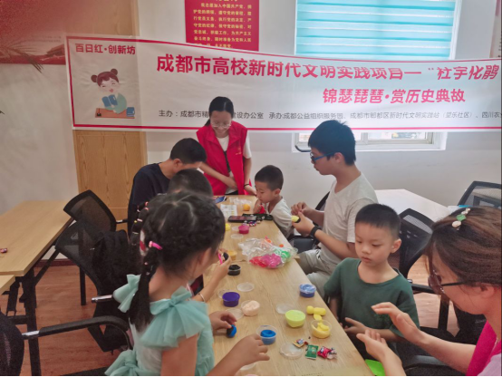 郫都典故“杜鹃啼血”中的人物各具特色,动科青工志愿者带领小朋友们开始捏制黏土,共同还原故事里的人物角色。志愿者肖思依说道:“小朋友们比我预想得更具有创造力,他们捏黏土的时候都非常投入。”黏土人物的制作需要小朋友有一定的动手实践能力以及创造力,年龄稍小的小朋友也在队员帮助下认真地参与其中。幻灯片中呈现了主要人物的形象图片,在约半小时的创造环节里,小朋友们将黏土捏制为望帝、鳖灵、百姓、杜鹃等人物角色,有的小朋友还特意为人物加上了发饰,无限的创造力给动科青工志愿者留下了深刻印象。“我还以为小朋友们没办法还原PPT上的人物,但是他们捏得有模有样的,有几个小朋友还在图片基础上多捏制了一些人物的配饰。”志愿者熊瑜萌分享到。小朋友们手拿自己制作的黏土人物,组成了一支表演小队,与实践队员一起参与了历史典故配音环节,亲身加入到历史故事情境中,将活动最初观看的“杜鹃啼血”的典故生动演绎。