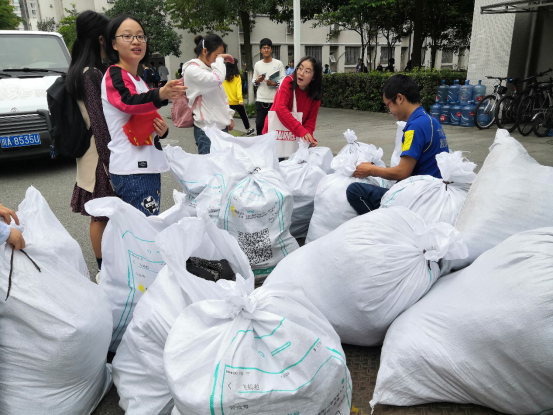 活动前期,部分志愿者在小广场设点收集军训服,部分志愿者在各个寝室楼下值班收集军训服。 军训服回收完后,志愿者们一起将鞋子、雨衣、套装、皮带、腰带分类装袋。活动后期,志愿者们将各类用品进行义卖,筹得一笔善款捐给了偏远地区的孩子们。
