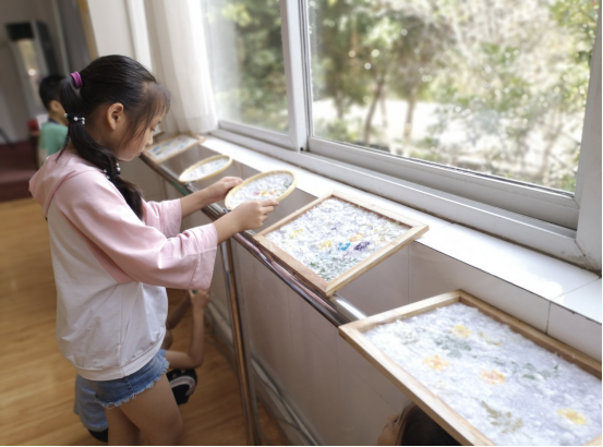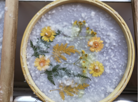 首先取20-30g纸浆兑2-3L水,用搅拌器搅拌均匀,随操作者心意在纸浆水里放入花草亮片等。再加入适量造纸胶(一次加入5-10ml)与纸浆水搅拌均匀,将造纸框斜放入纸浆水中左右轻轻摇晃,让纸浆着陆在网框上,抄纸用干花或者鲜花草根据自己的设计想法摆放。再用勺子舀少量纸浆轻轻浇盖在花草上,注意动作轻柔,纸浆薄薄一层即可。将造好的纸放在通风有阳光的地方晾干即完成,成品纸可以做装饰画、书签等。一个小时后,孩子们都完成了自己的作品,大家手捧着自己心血的结晶,脸上都露出了满足的笑容。