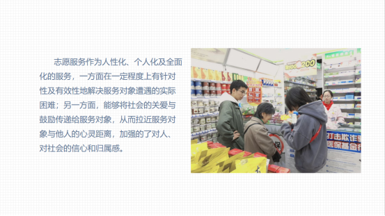 “成为一名青年志愿者并不困难,只要怀揣着一颗向上向善、热爱公益的心,就可以成为一名志愿者。”肖茜同学说到。接着她向大家分享了志愿者们和北街社区张奶奶的故事。张奶奶由于眼睛不好,不能独自去买菜,而川农大新葡的京集团8814青工部的志愿者们却连续十余年进行爱心接力,帮助张奶奶,这其中的点点滴滴,有趣的故事数不胜数。