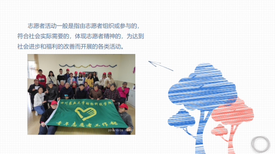 志愿服务知多少。在分享会的开始,肖茜同学先向中学生志愿者们分享了一些有关志愿服务的知识,如什么是志愿活动——志愿活动包括志愿者组织机构的组建活动、志愿者的培训活动、志愿者的交流活动、志愿者的服务活动、志愿者的推广和宣传活动。