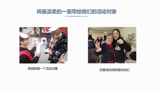 “做志愿活动的原因,是因为有需求,或者是周围出现了一些不良现状,志愿者根据活动对象的需求,通过志愿活动来改善这种现状。奶奶们需要陪伴,我们就去带给她们快乐;某地出现消防安全问题,就可以组织消防安全宣讲或消防演练等活动。”主讲人肖茜对参会同学分享道。