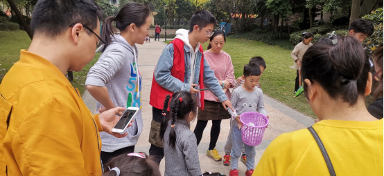 老虎吃汤圆,提升家长与孩子之间的默契。一名家长拿着桶站在线后2-3米,孩子们依次将20个小球投向桶内,家长可以在线后移动接球,在规定时间内按照接球数量进行积分。在这个活动中,志愿者们明显感受到孩子与家长之间的默契与相互鼓励的融洽气氛。