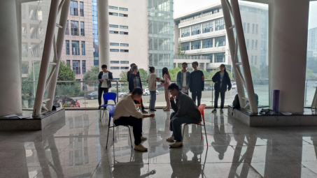 早在半个月前,志愿者们就已经开始在学校积极排练话剧了。图为万爷爷的扮演者陈宇翔与赵爷爷的扮演者赵坤山正在“下棋”,即便没有实物,大家也通过自己精湛的演技,将话剧完美地展现了出来。