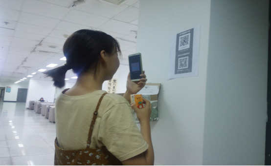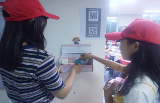 志愿者们进入图书馆后,便放轻了自己的脚步,生怕打扰到周围正在努力学习的同学们。在每一间厕所前,动科青工的志愿者都放有一个手工制作的盒子,用来放纸巾,以便需要的同学方便拿取,其上还附有一个二维码,每一包纸都需要同学们自觉付款,这些钱将全部捐给需要的孩子。