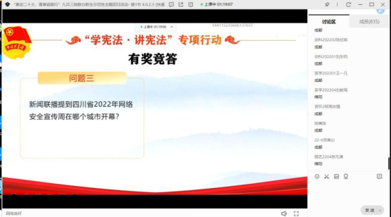 园艺学院领学人何浩、朱媛媛同学以“新闻联播”的形式,将当下时事与宪法知识相结合,题材新颖、主题明确,加深团员青年对宪法的理解与认识,引领同学们树立起知法、懂法、守法的正确标杆。随后,进入宪法知识竞答环节以播报内容为题,团员青年们积极踊跃作答,在巩固宪法知识的同时也将活动推向高潮。