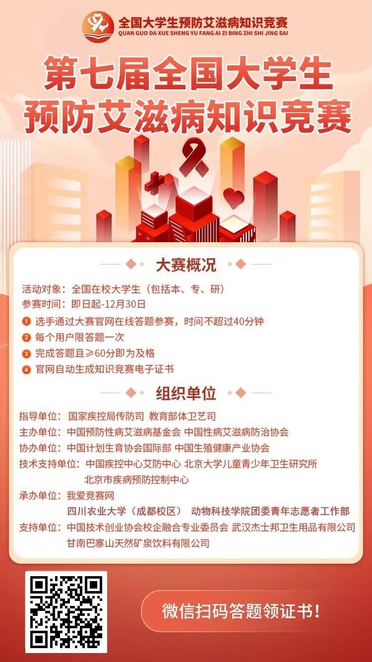 为牢固树立大学生预防艾滋病的红线,11月11日至12月3日,动科学院团委积极响应第七届全国大学生预防艾滋病知识竞赛活动,特组织承办第七届全国大学生预防艾滋病知识竞赛,开展“飘扬红丝带,携⼿温暖艾”主题系列活动。据悉,本次活动我校成都校区的同学们积极报名,共有1071人次成功参与,收获满满。
