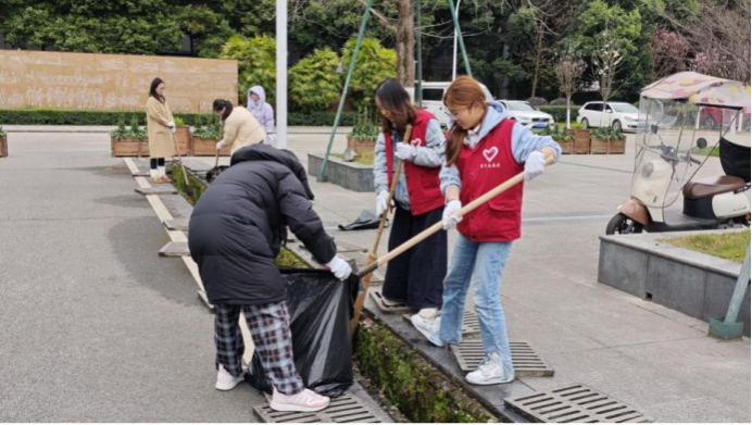历经两小时酣畅淋漓的劳动,银杏大道焕然一新。这两个小时中,志愿者们或俯身清理沟渠杂物,或挥帚聚拢银杏落叶,或持锹铲除顽固泥渍,满怀对志愿服务的热忱与期待。雨雾朦胧中,志愿者们劳动的身影绘成校园里一道亮丽的风景。